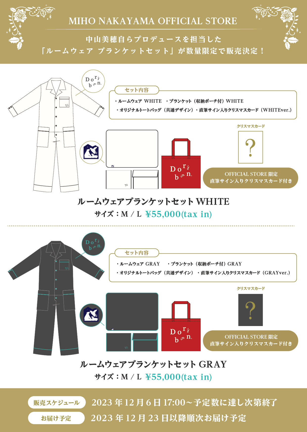 ・MIHO NAKAYAMA OFFICIAL STORE にて「【お渡し会1部or2部】ルームウェアブランケットセット」の WHITE、GRAYいずれかを購入された方