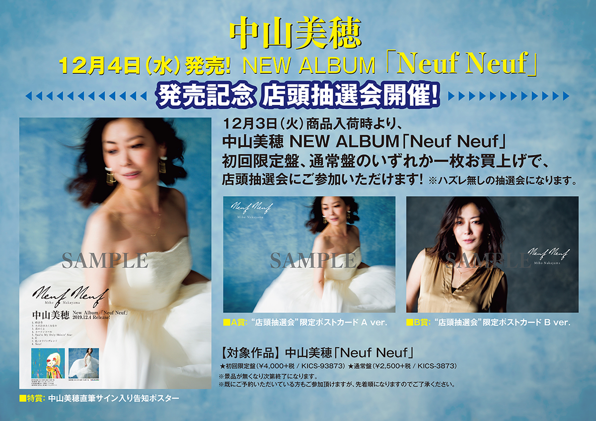 12月3日(火)商品入荷時より、中山美穂NEW ALBUM「Neuf Neuf」初回限定盤、通常盤のいずれか一枚お買上げで、店頭抽選会にご参加いただけます!