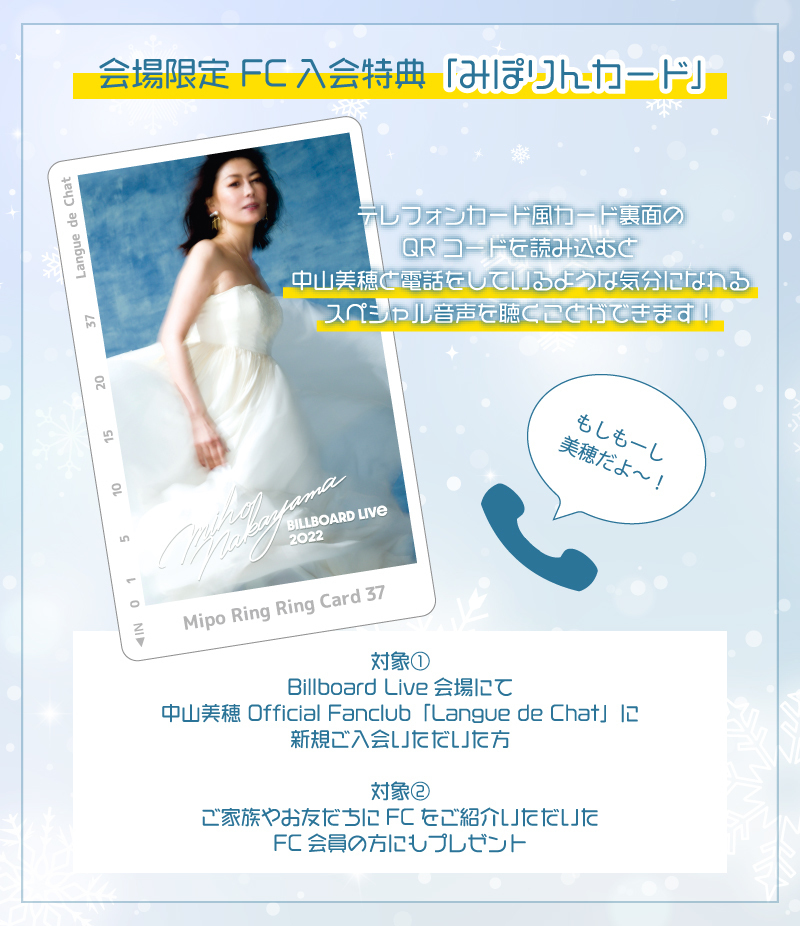 すでにFC会員の方が、ご家族やお友達に中山美穂 Official Fanclub「Langue de Chat」をご紹介いただき、その方が会場にてご入会いただいた場合、ご紹介者様にも会場限定FC入会特典『みぽりんカード』をプレゼントいたします!