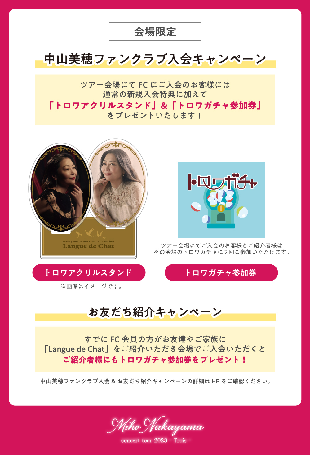 ツアー会場にて中山美穂 Official Fanclub「Langue de Chat」にご入会いただいた方に、会場限定入会特典『トロワアクリルスタンド』と『オンライントロワガチャ』参加券をプレゼント!